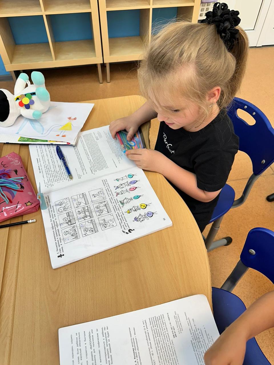 Уроки по подготовке к школе проходят в игровом формате. Одно занятие включает в себя три направления — письмо и чтение, математика, общее развитие. После каждого направления проходит полезная переменка (где мы работаем с мячом, карточками).
